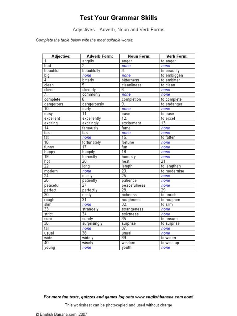 Adjectives adverb noun verb forms. List of verbs, nouns, adjectives and adverbs.pdf. Here is an update to this list so that it now contains 54 words. Take a look at the the following examples of nouns, verbs, adjectives, adverbs, prepositions, subjects and objects: An adverb is similar to an adjective, but instead of describing the noun or pronoun in a sentence, it describes the verb.
